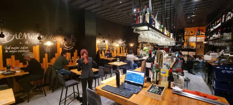 Am letzten Abend spazieren wir an die Plaza de Santo Domingo mit Blick auf das Teatro Romea. Dort gehen wir in ein italienisches Lokal mit Pizza, Pasta und Wein …