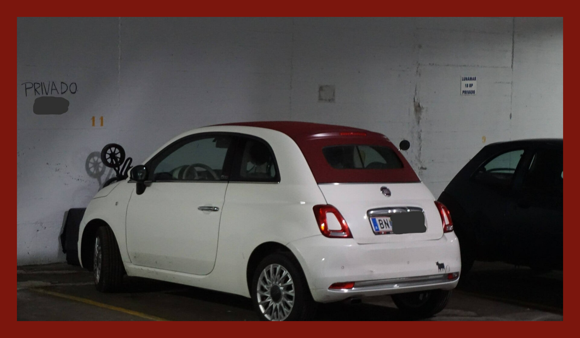 Jetzt nehme ich euch einmal kurz in unsere Tiefgarage mit, ihr werdet es nicht glauben - Was für ein Anblick! Da parkt seelenruhig ein kleiner Fiat 500 mit BN-Kennzeichen (Baden bei Wien). Fast so, als wäre er nur kurz zum Heurigen um die Ecke gefahren, dabei hat der Kleine wohl einen heldenhaften Roadtrip hinter sich, stolze 2.780 Kilometer! Wer seinen Fiat von Baden nach Calahonda fährt, braucht viel Sitzfleisch, eine extrem gute Playlist und eine riesige Portion Humor - Respekt! Und an dieser Stelle sei allen Skeptikern gesagt: seht ihr, auch ein kleines Auto schafft lange Strecken!! 😉