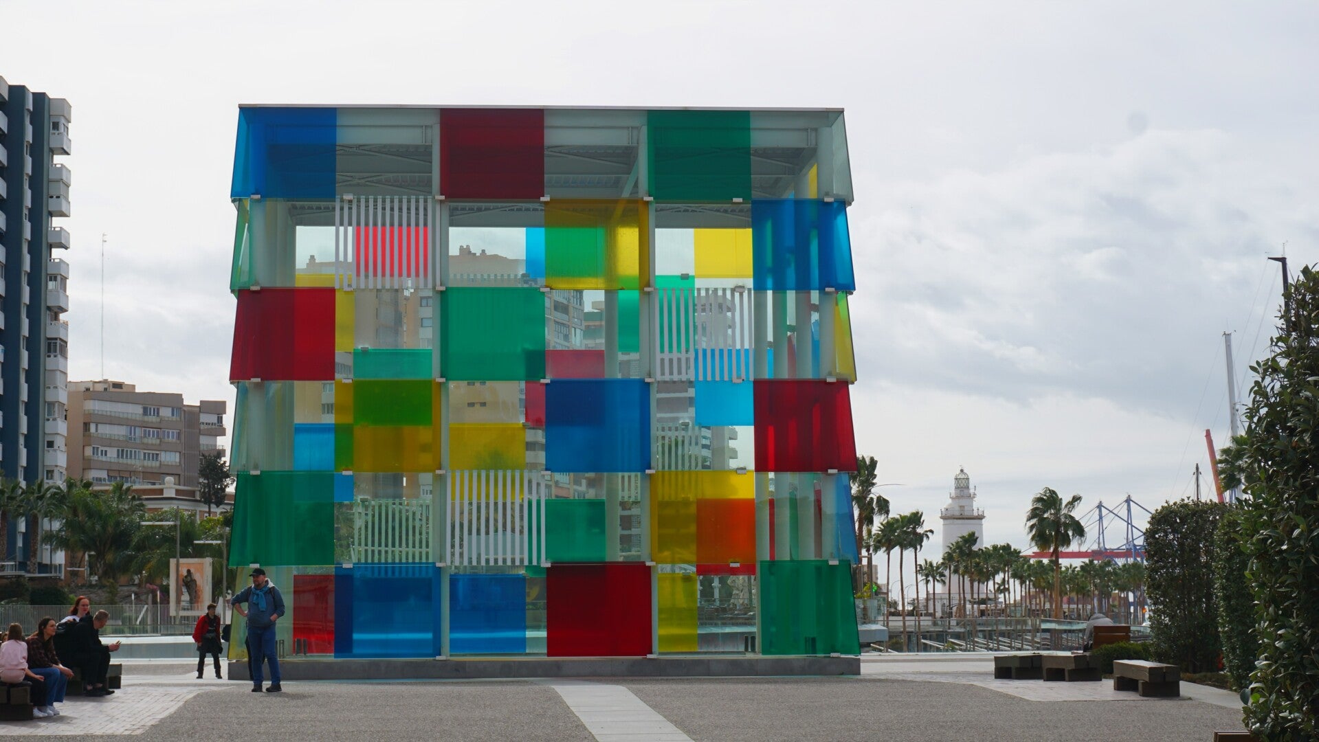 Wir kommen aus dem Parkhaus und landen gleich auf der Muelle Uno, auch Pier One genannt. Unübersehbar vor uns ein großer, bunter Würfel, das Centre Pompidou. Sieht aus wie ein riesiger Zauberwürfel, aber eigentlich ist er nur der gläserne Deckel für den unterirdischen "Kunst-Bunker"