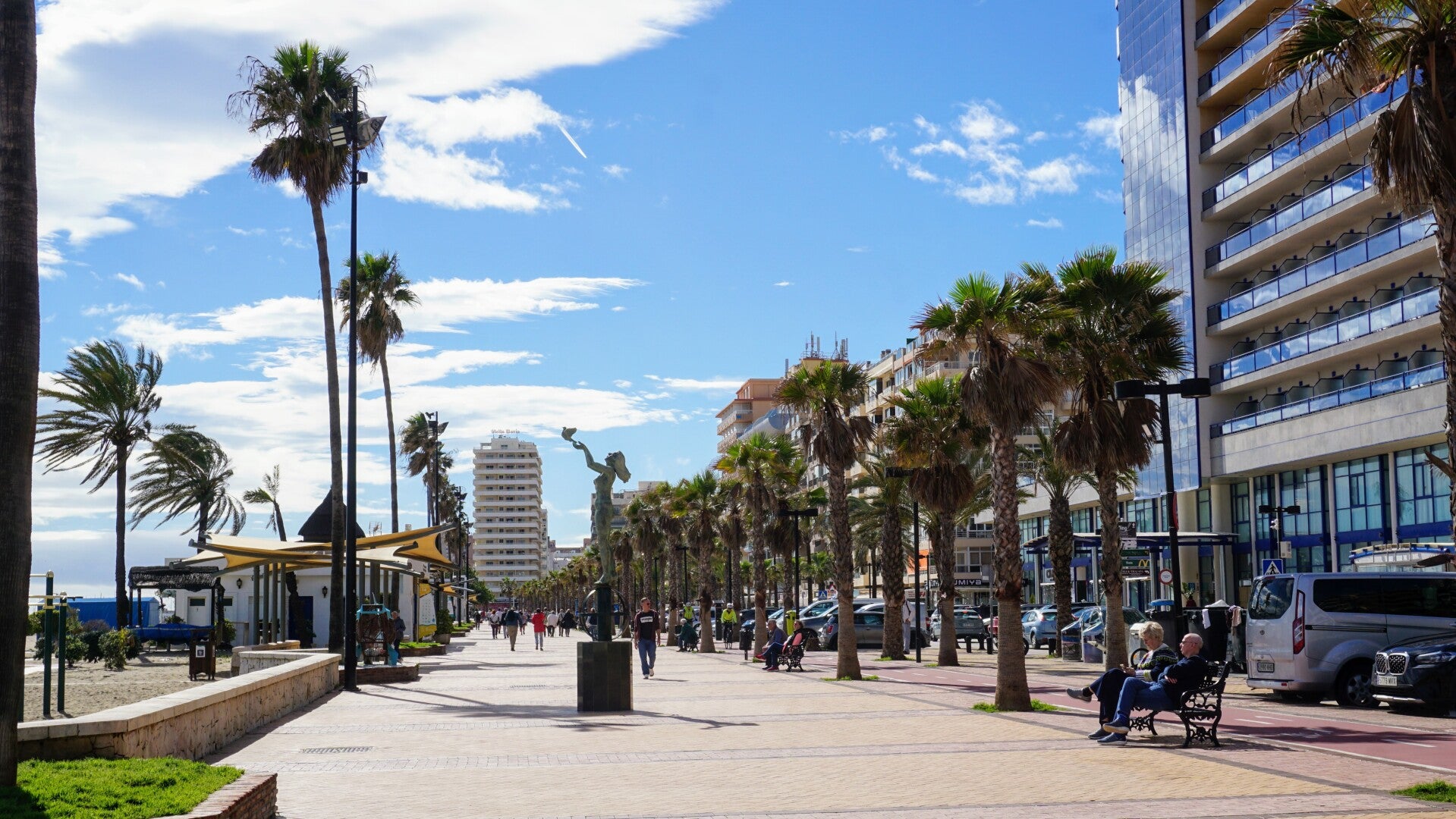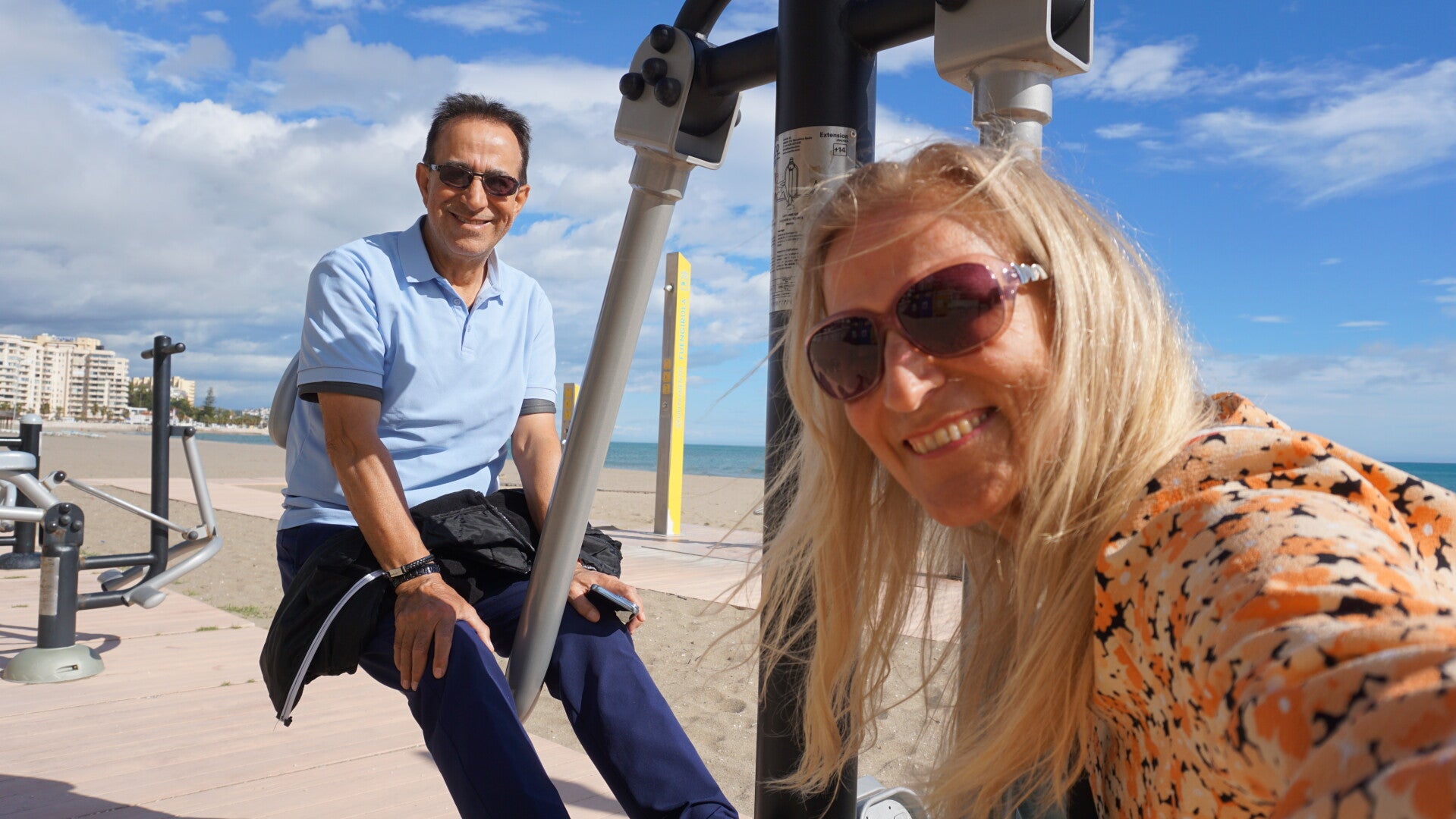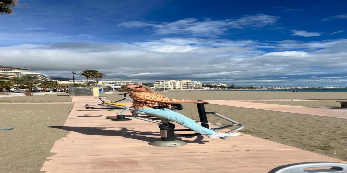 Nicht weit von uns befindet sich die Stadt Fuengirola. Obwohl sie 85.000 Einwohner hat, ist sie flächenmäßig eine der kleinsten Städte Spaniens. Da wurde oft mehr in die Höhe als in die Breite gebaut, wie mir an manchen Stellen nicht so positiv ins Auge gesprungen ist. Obwohl nach genauerem Hinschauen muss ich das revidieren, es gibt viele belebte und quirlige Plätzchen und für Sonnenanbeter ist es ein Paradies! Acht Kilometer Strand, auf der einen Seite das glitzernde Mittelmeer und auf der anderen wird der Paseo Marítimo zur längsten Fitness-Meile der Costa del Sol. Hier trainierst du nicht in einer muffigen Box, sondern in der ersten Reihe fußfrei. Die Geräte? Blitzblank, salzwasserresistent und bereit für deine Performance. Und das Workout-Selfie dort ist reine Poesie. Es reicht völlig, sich drei Minuten lang mit heroischem Blick an die Klimmzugstange zu hängen, während im Hintergrund die Sonne auf den Wellen tanzt. Das ist kein Training, das ist purer Lifestyle!