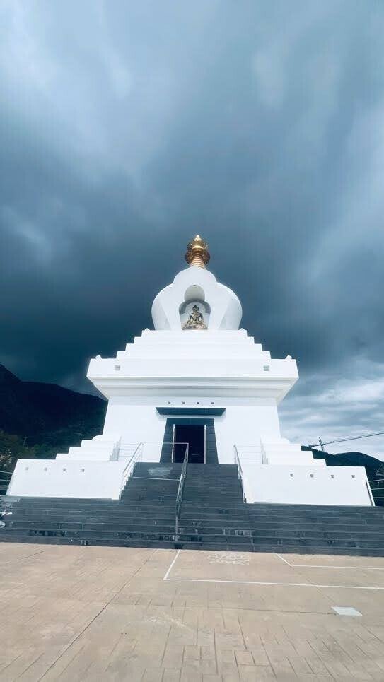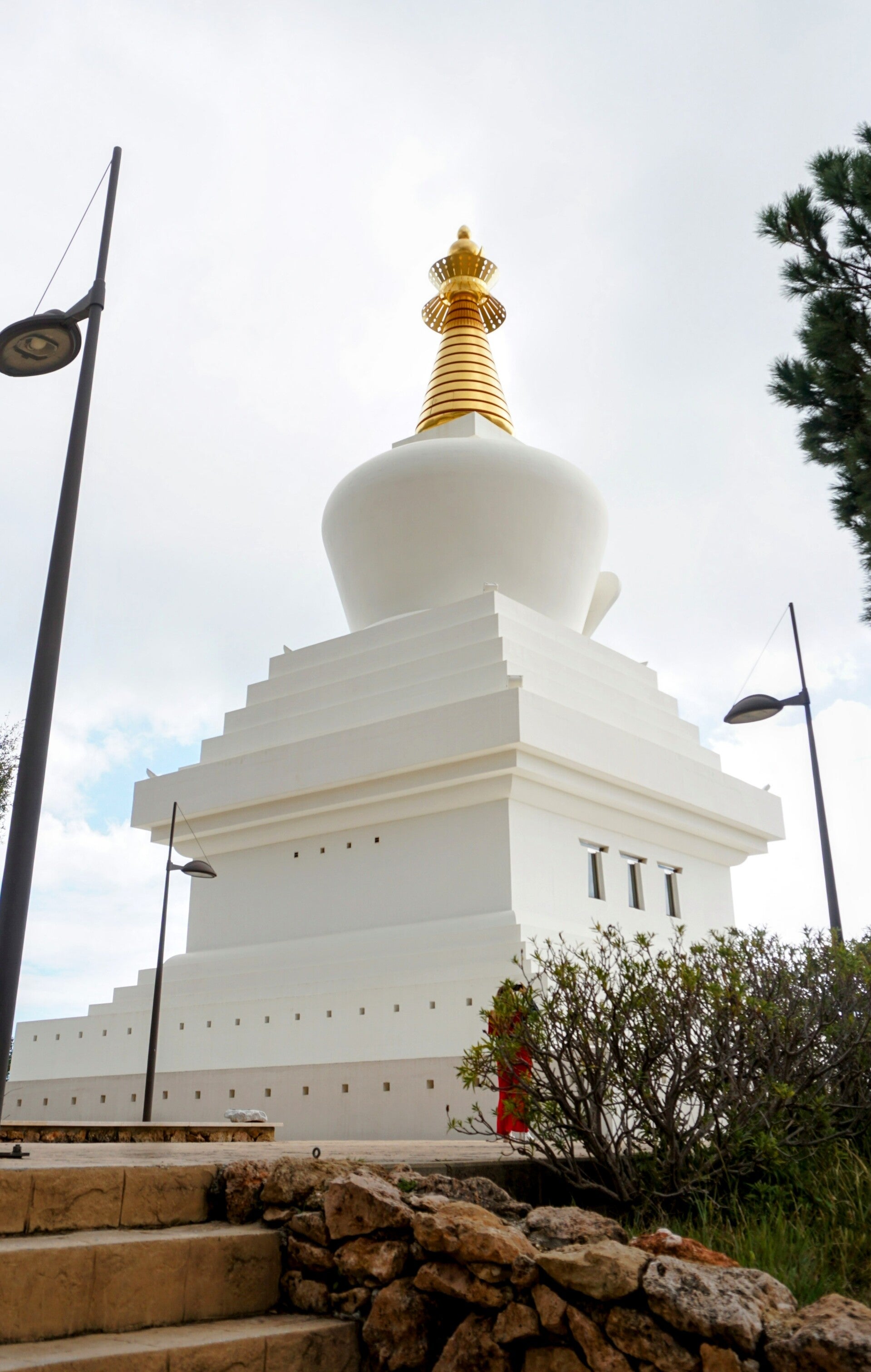 Nicht weit davon entfernt wartet das nächste Highlight: die Stupa de la Iluminación. Ein Stupa ist ein zentrales buddhistisches Bauwerk, das als Symbol für Buddha, seinen Geist und seine Lehre (Dharma) fungiert. Ursprünglich als Grabhügel für Reliquien des Buddha entstanden, dienen Stupas heute als Orte der Verehrung, Meditation und zur Förderung von Frieden und Harmonie. Sie repräsentieren zudem den Weg zur Erleuchtung. Der Stupa in Benalmádena ist mit 33 Meter Höhe der Größte in Europa. Leider habe ich erst hinterher gelesen, dass ich die Stupa im Uhrzeigersinn umrunden hätte sollen, das nennt man "Kora" und laut Tradition bringt das nicht nur Glück, sondern hilft auch dabei Wünsche wahr werden zu lassen! Tja, da hätte ich lieber mal vorher die Betriebsanleitung für buddhistische Bauwerke gelesen! Aber was solls - bei diesem Panoramablick über die Costa del Sol bis Afrika ist man sowieso schon im siebenten Himmel - auch ohne korrekte Laufrichtung!