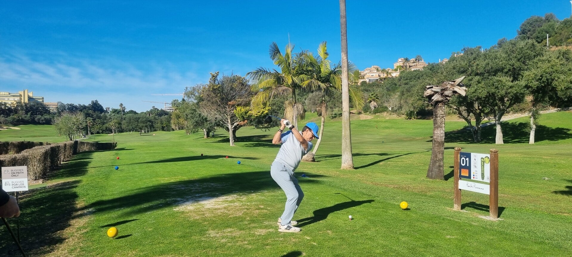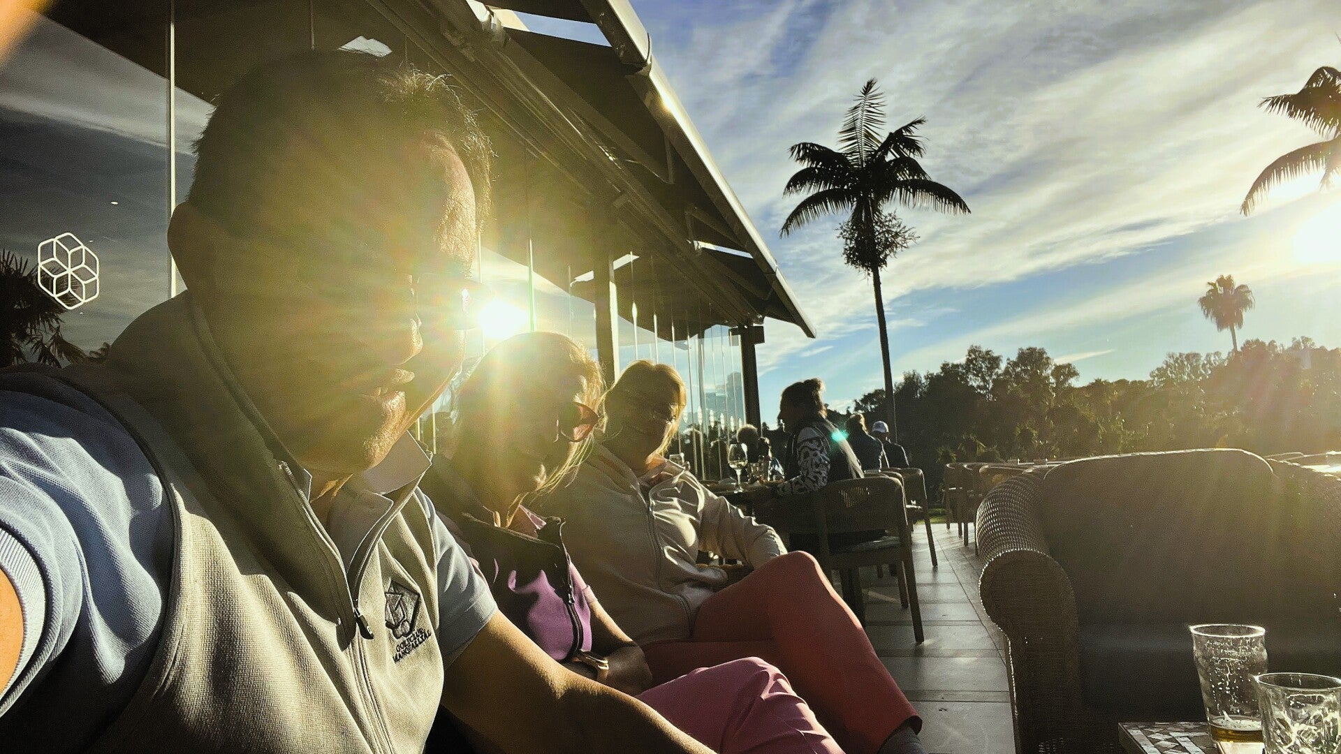 Aber wir haben alles mit Bravour überstanden, konnten das Wetter und die wunderbare Umgebung trotzdem genießen (ich zumindest) und setzen uns danach auf die Sonnenterrasse und erfreuten uns an unseren Getränken, bis die Rechnung kam: Willkommen im Reich der „Marbella-Mathematik“, wo die Preise schneller steigen als der Blutdruck nach einem Triple-Bogey! Wenn 30 Euro für drei Bier und einen Cider fällig werden, hat man die Zone der normalen Gastronomie verlassen und den „Elitär-Sektor“ betreten. Und Elitär sein bedeutet: Schweigen und Zahlen.
