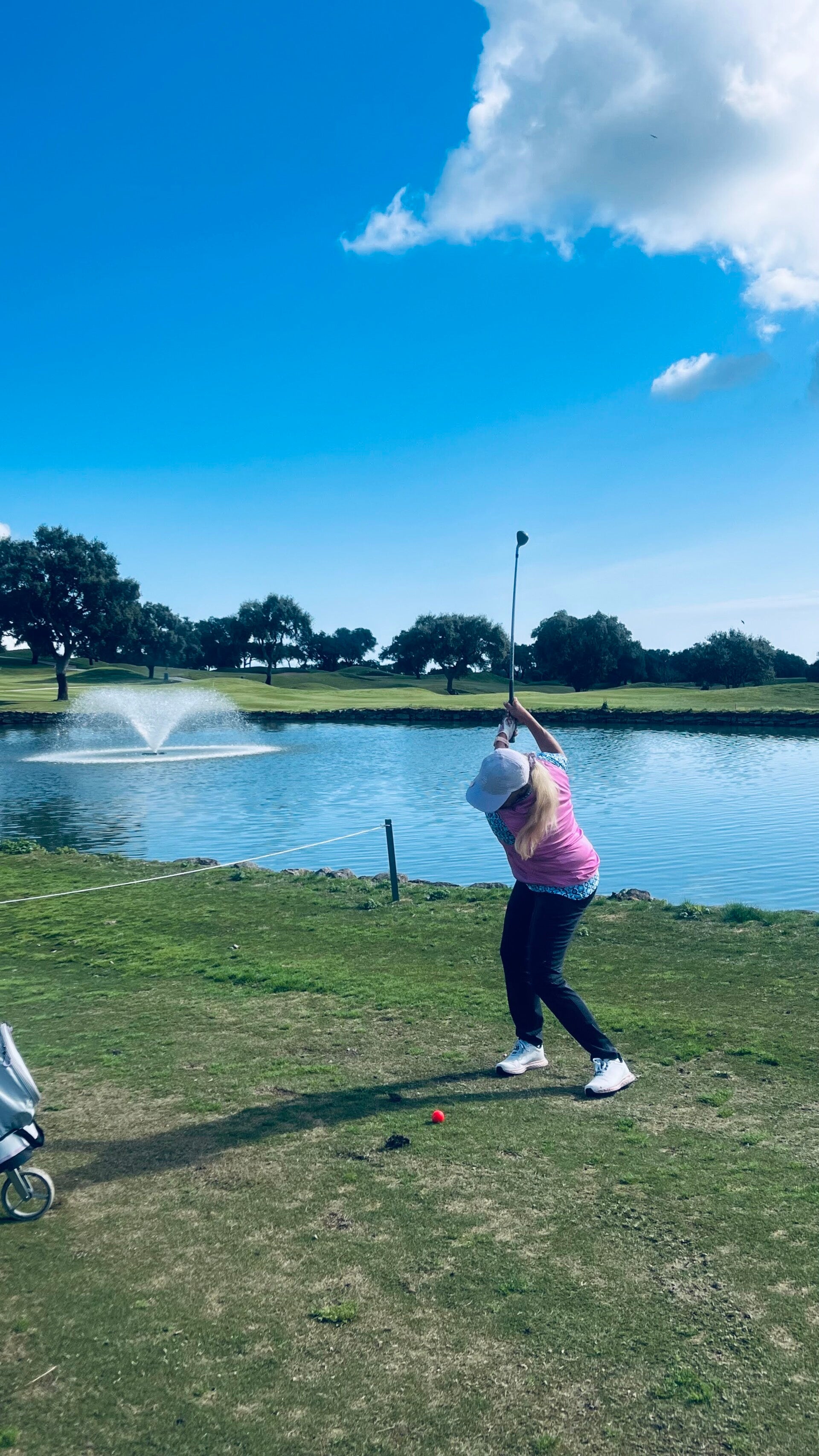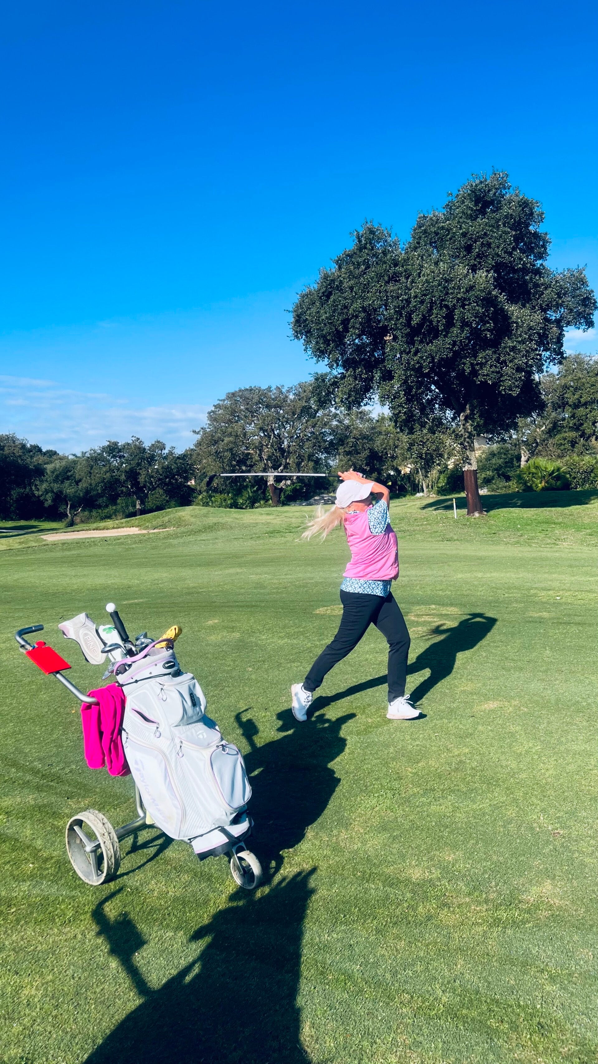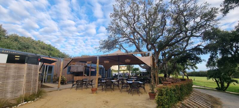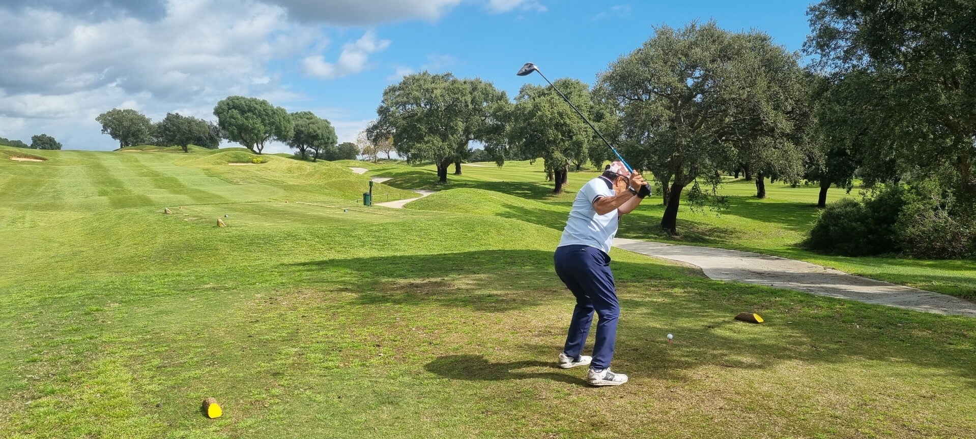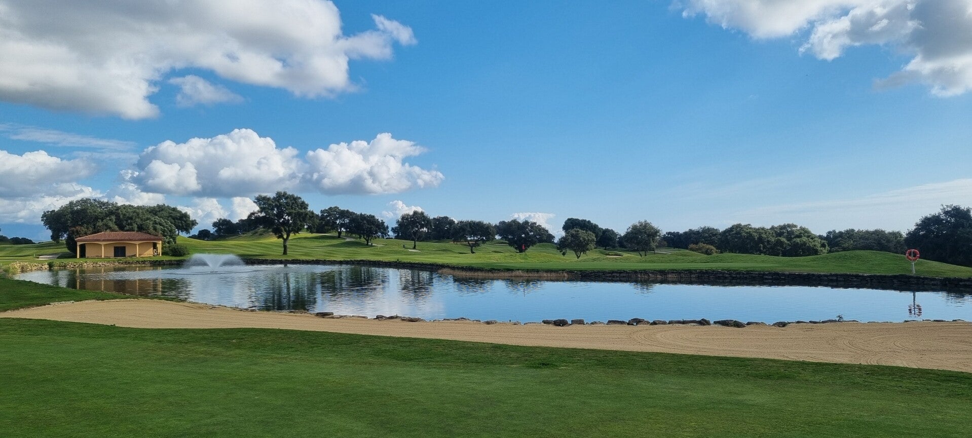 Wir spielen den "New Course", ein Linkskurs der 2003 eröffnet wurde. Er gilt zwar als "kleiner Bruder" des Old Courses, ist aber eine echte Herausforderung mit dem hügeligen Gelände (und das ist sehr diplomatisch ausgedrückt!) Und diese Bunker! Wie in Ägypten! Manche der Sandhindernisse erinnern uns an Makadi Bay, fehlt eigentlich nur noch das Kamel am Rand. Und so riesig! Wer da reingerät, braucht kein Sand-Wedge, sondern eine Baugenehmigung und eine Strickleiter! Als ob der Sand nicht reichen würde, gibt es noch genug Wasserhindernisse, um genügend Bälle zu versenken. Und Nein! Von mir landete diesmal kein einziger im Nass!! Doch wie so oft gilt auch hier: Präzision ist Pflicht. Wenn dein Drive zu sehr streut, wirst du die örtliche Flora mit ihren harten Korkeichen sehr intim kennenlernen.